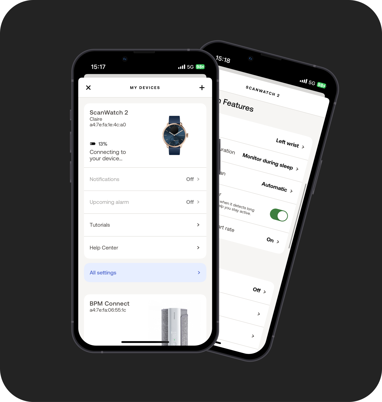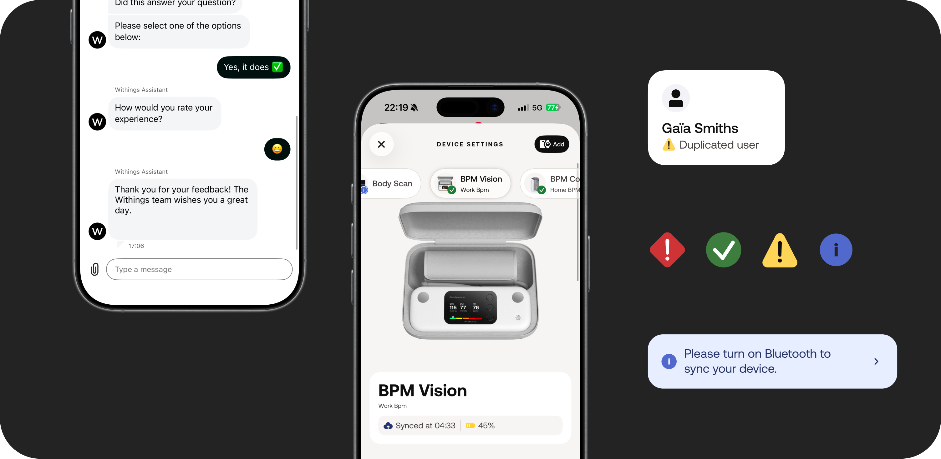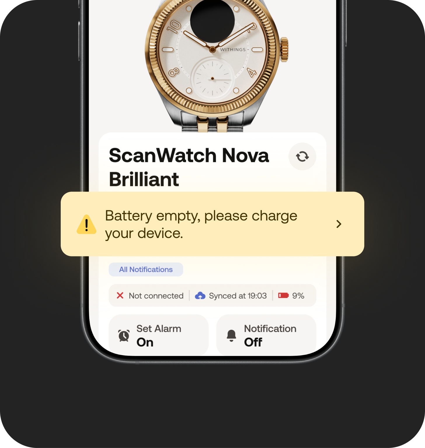 Surface battery, connectivity, last sync, and device health upfront so users can quickly answer: Is my device working? through device settings notifications.